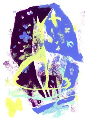 旅・自然・生き物たちをモチーフに、ローラーを使い版画のようにアクリル絵の具を広げ、テクスチャーを活かして描く技法と、ボールペンや色鉛筆・パステルの混合技法で表現しています。